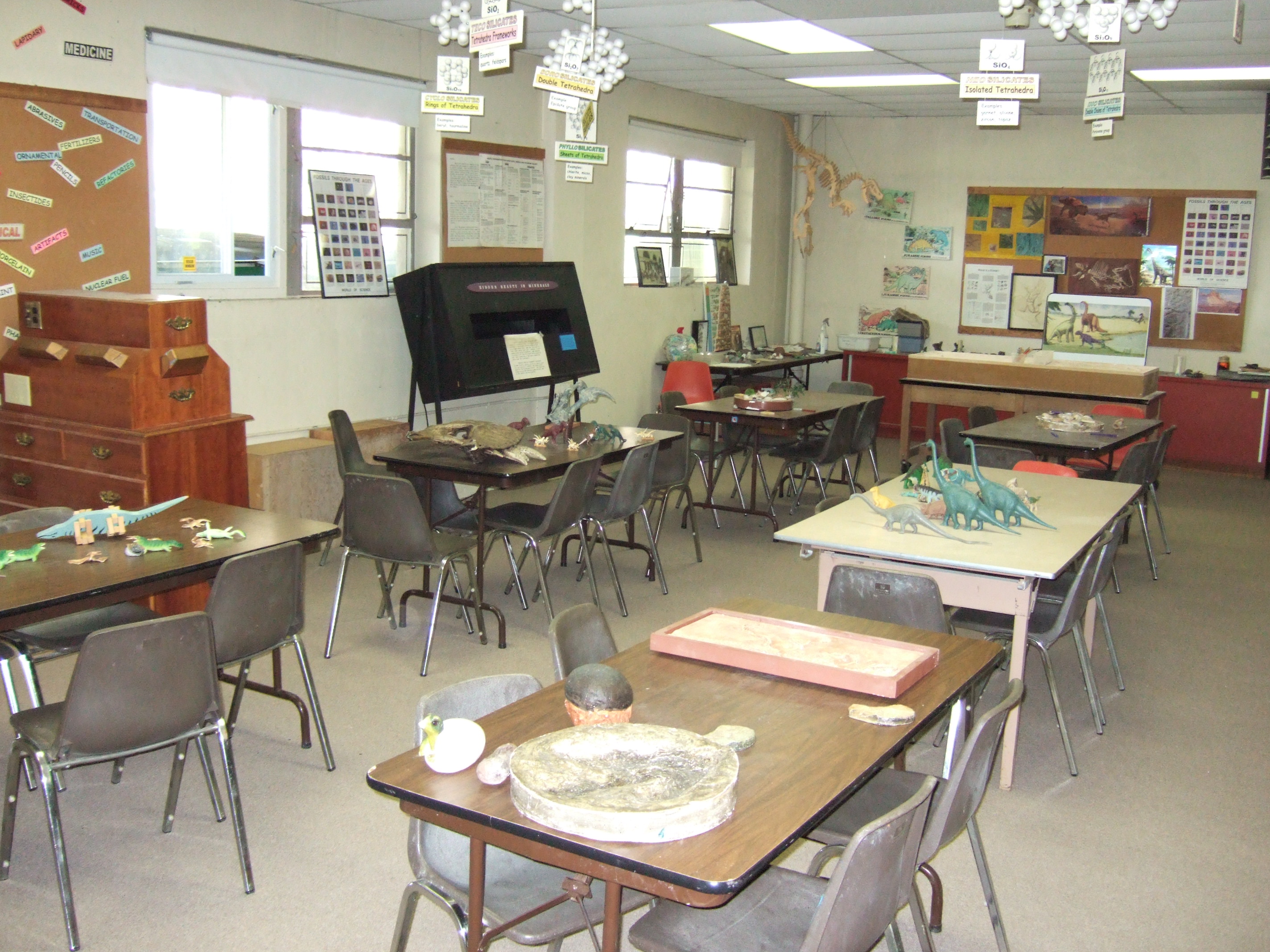 This is the mineral room, where we teach the paleontology lessons. Everything is all set up on the tables for a typical half-hour lesson on dinosaurs and prehistoric life: what are fossils and how are they formed, what makes a dinosaur a dinosaur, plant-eating dinosaurs, meat-eating dinosaurs, and two activity tables in the back where you can make your own fossils. There are other fossils, both real and replicas, which are in the room. There’s also a large collection of (of course) minerals such as quartz, mica, and various other rocks.