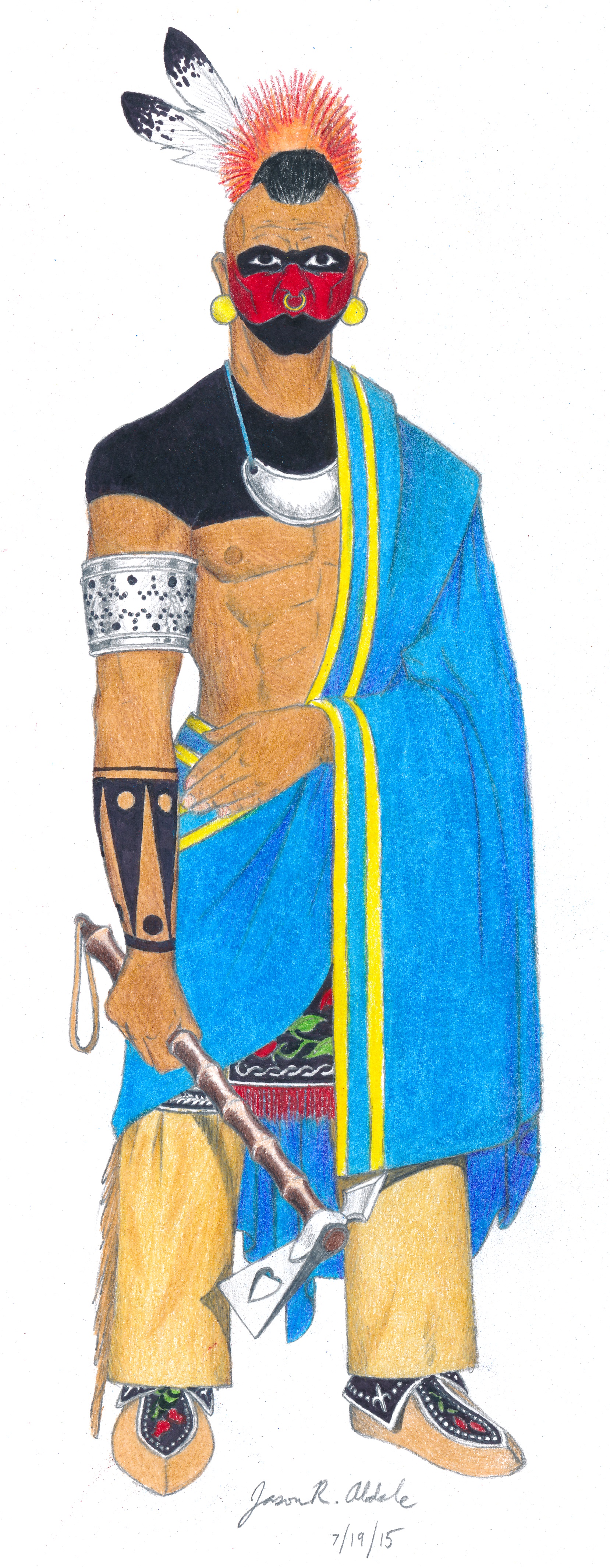 I found the original version of this man’s portrait that I had made back in 2005, I think – there was no date on it, but I’m pretty sure that’s when I first drew him. The overall pose and design was the same, but it was less detailed, done with markers instead of colored pencils, and was rather sloppy. I decided to re-make Long Spear’s portrait, and the result is what you see here.