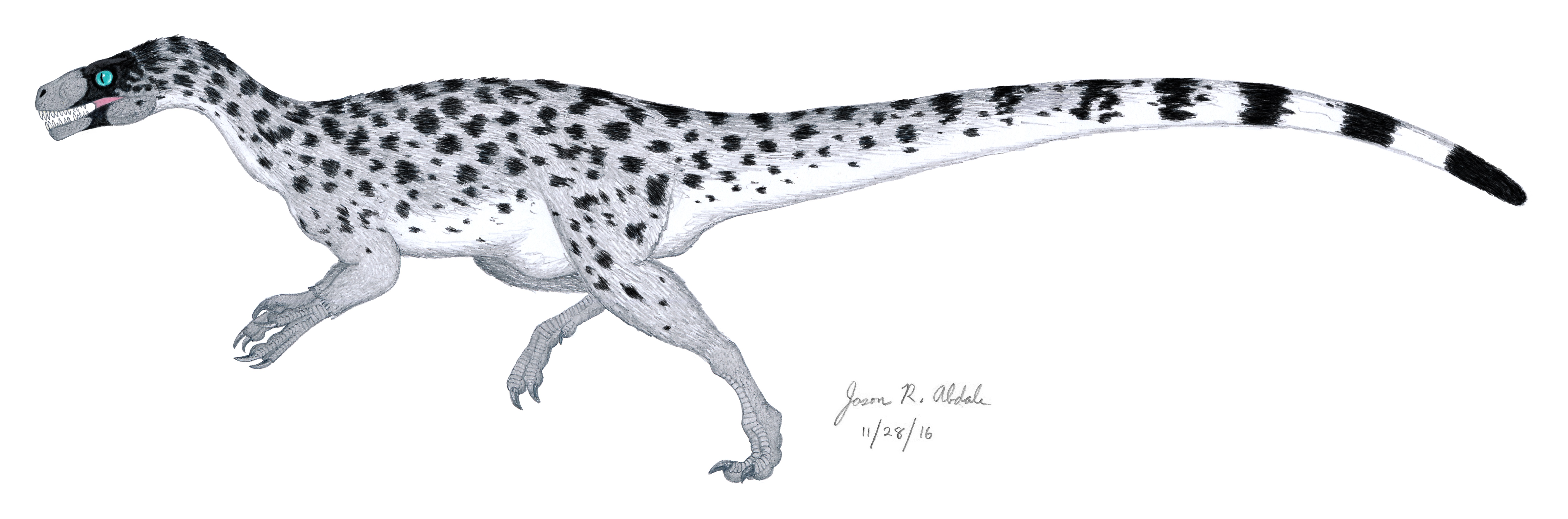 A while back, I drew a picture of Ornitholestes and posted it to this blog. However, it was an “old school” picture portraying Ornitholestes covered in scales. I have recently made an updated version, and I’m posting that image below.