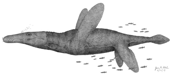 I’m happy to say that I have recently done a revised drawing of this 25-foot long marine reptile, and I think that it’s a substantial improvement over the earlier illustration. Here is the “new and improved” version…
