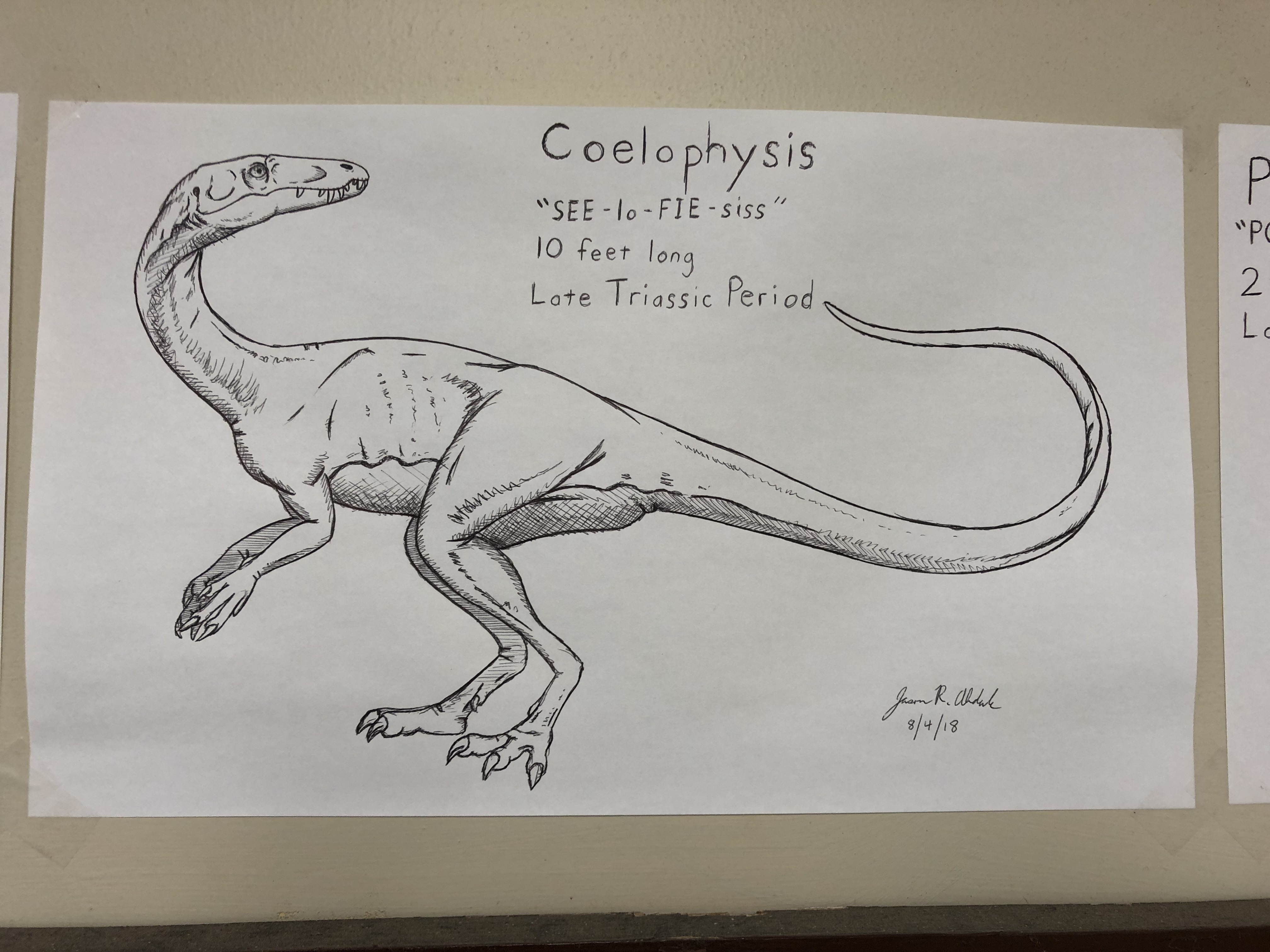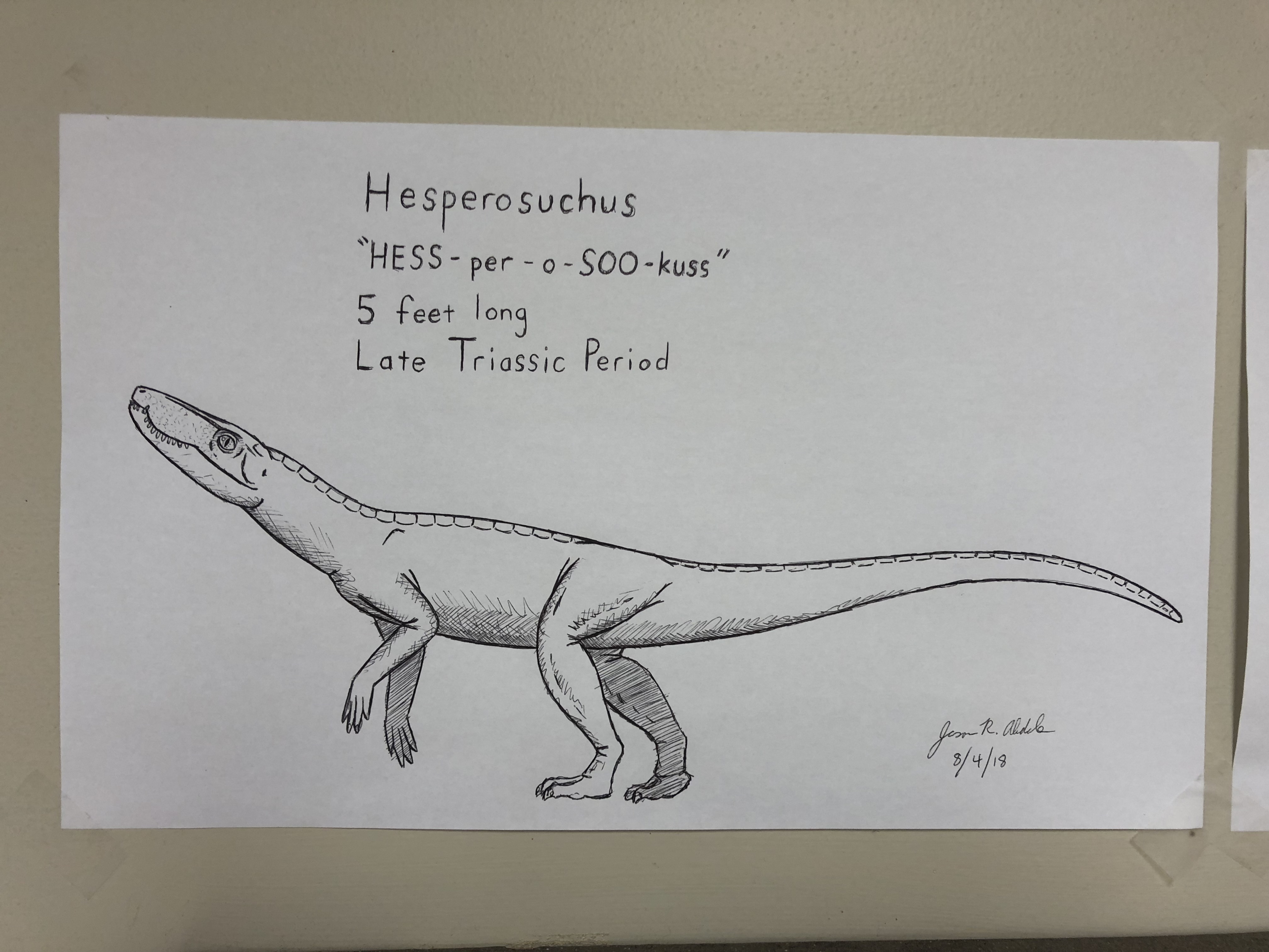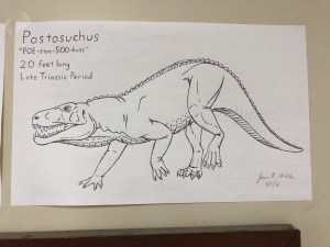 Hi everybody. As many of you already know, I occasionally volunteer at the Garvies Point Museum in Nassau County, New York. One day, I decided to hash out some drawings of Late Triassic creatures when I had a few moments of spare time, and I stuck them on the wall over the bulletin board. Recently, I went back to the museum for their annual Native American Feast, and to tell you the truth, I had completely forgotten about these pictures. I decided to take some photos of them while I was there. I’m hoping that the museum staff uses them for coloring activities with the children that visit the museum every week.
