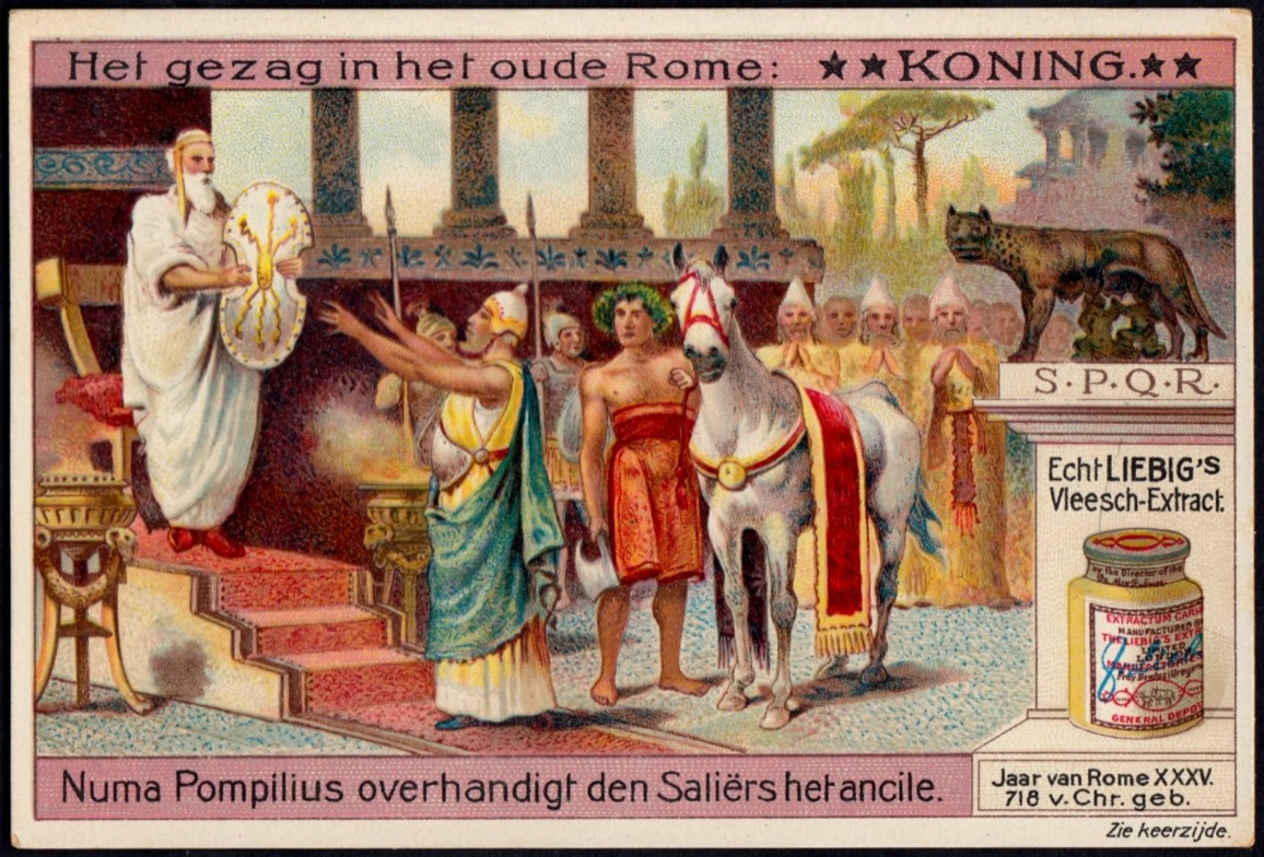 “Numa Pompilius hands over the ancilia to the Salians”. Collectible card from Liebig’s Beef Extract, Dutch issue, 1911.