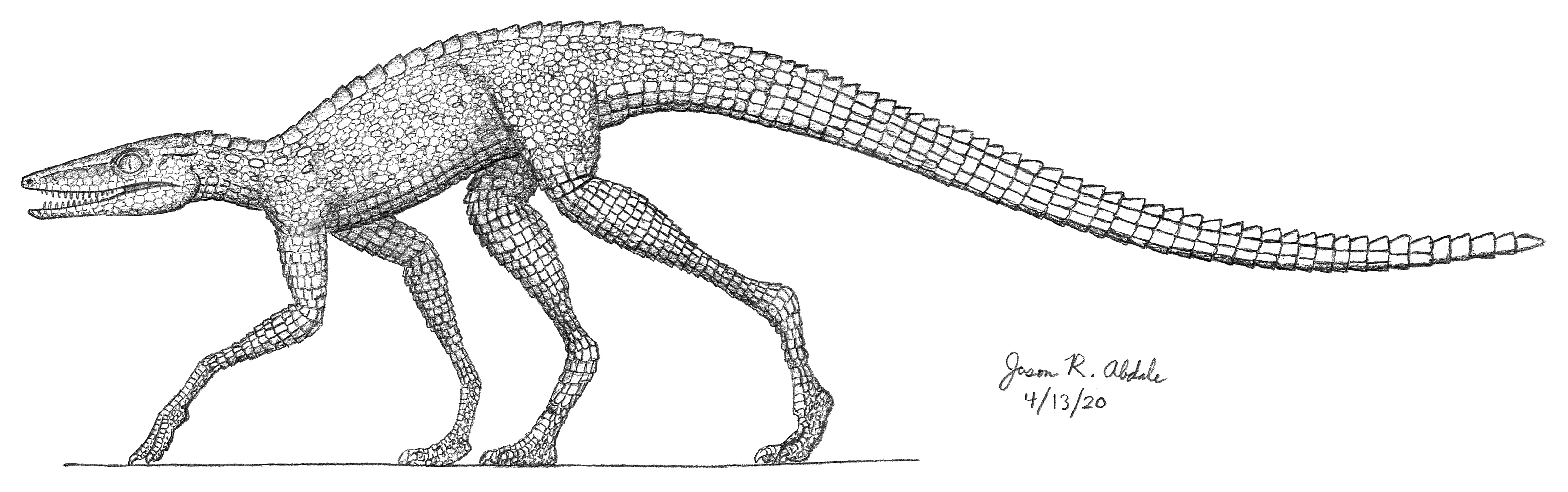 Sphenosuchians like Hallopus, Macelognathus, and Terrestrisuchus have traditionally been depicted in paleo-art as being quadrupedal. However, many of the renditions of these animals walking quadrupedally look downright awkward. The back is shown as being strongly arched to the point where it looks as if its spine is being curved beyond its natural state, the joint between the cervical vertebrae and the dorsal vertebrae is cranked into a very uncomfortable position, and due to its long back legs, its rear end is so high up in the air that it almost looks as if its “presenting” to its mate.