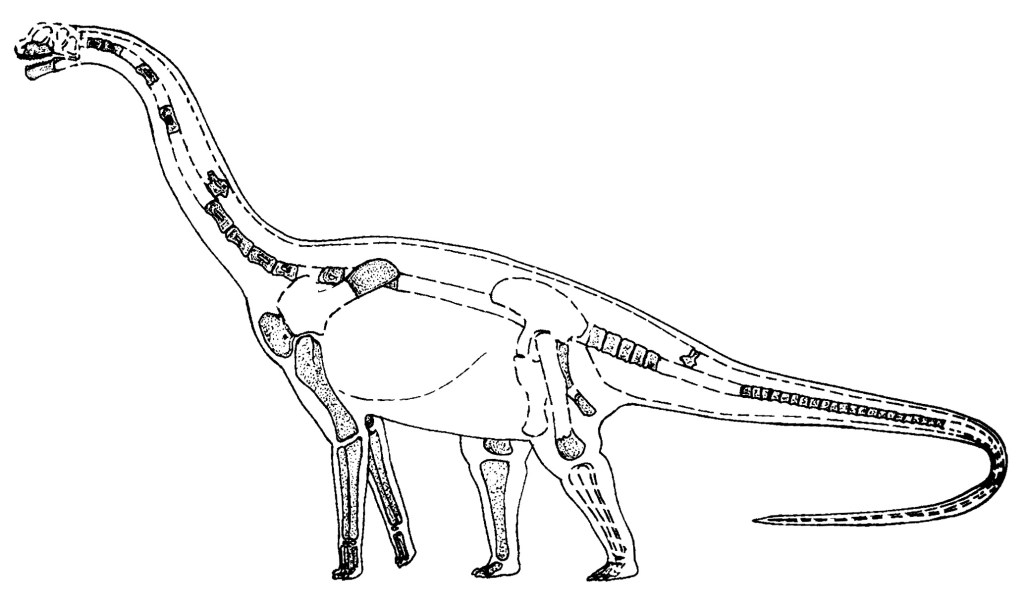 Partial skeleton of Pleurocoelus nanus. Caption reads as follows: “Restoration of the Sauropod (herbivorous) dinosaur Pleurocoelus nanus Marsh from Maryland. 1/16 natural size (original). Known portions shaded, remainder from Morosaurus”. Lull, Richard Swann; Clark, William Bullock; Berry, Edward Wilbur (1911), “Systematic Paleontology of the Lower Cretaceous Deposits of Maryland”. Maryland Geological Survey: Lower Cretaceous. Baltimore: The Johns Hopkins Press, 1911. Page 510, plate XI.