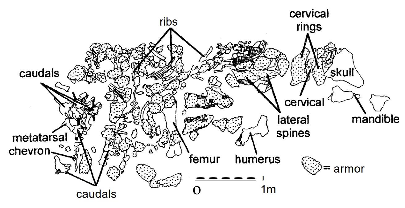 Quarry map of the fossil remains of Gargoyleosaurus parkpinorum, discovered at Bone Cabin Quarry, Wyoming. The polka-dotted pieces represent armor. From Brandon Killbourne and Kenneth Carpenter (2005), “Redescription of Gargoyleosaurus parkpinorum, a polacanthid ankylosaur from the Upper Jurassic of Albany County, Wyoming”. Neues Jahrbuch für Geologie und Paläontologie, volume 237 (July 2005). Page 113.