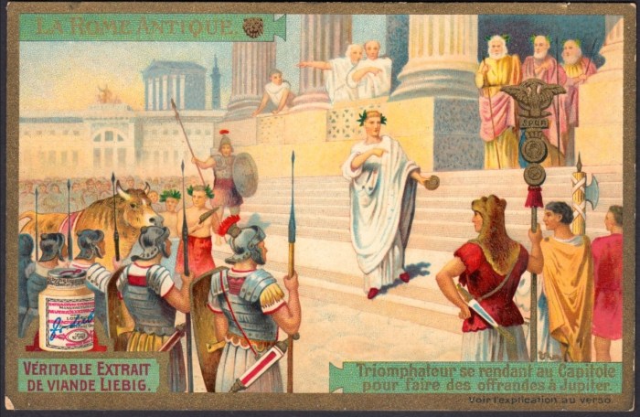 “Triumphant going to the Capitol to make offerings to Jupiter”. Collectible trading card from Liebig’s Beef Extract, Belgian issue, 1906.