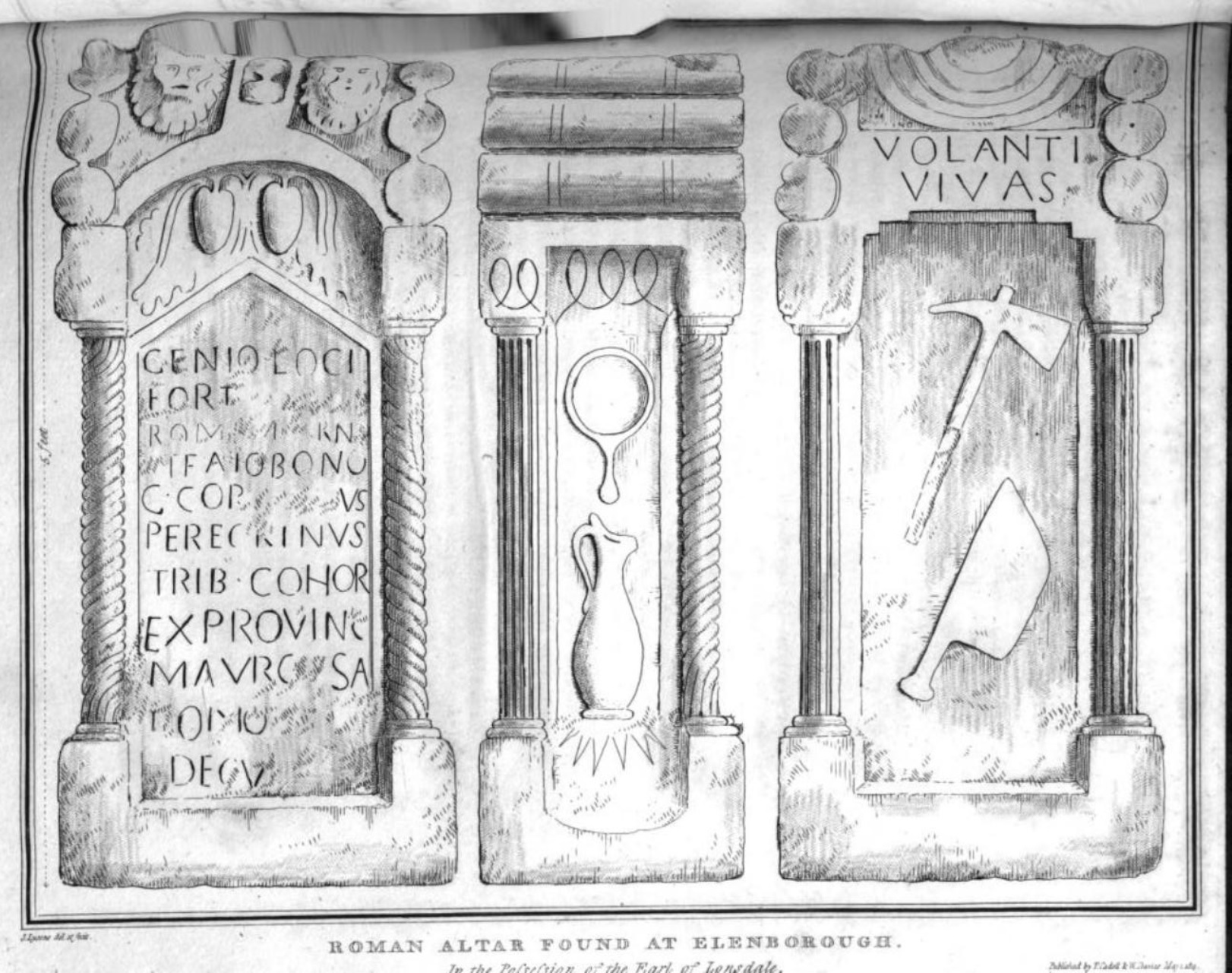 An illustration of the Roman altar found at Ellenborough which bears the inscription VOLANTI VIVAS. Reverend Daniel Lysons and Samuel Lysons, Esq., Magna Britannia, Volume IV: Cumberland. London. T. Cadell, 1816. Image plate between clxxii and clxxiii.