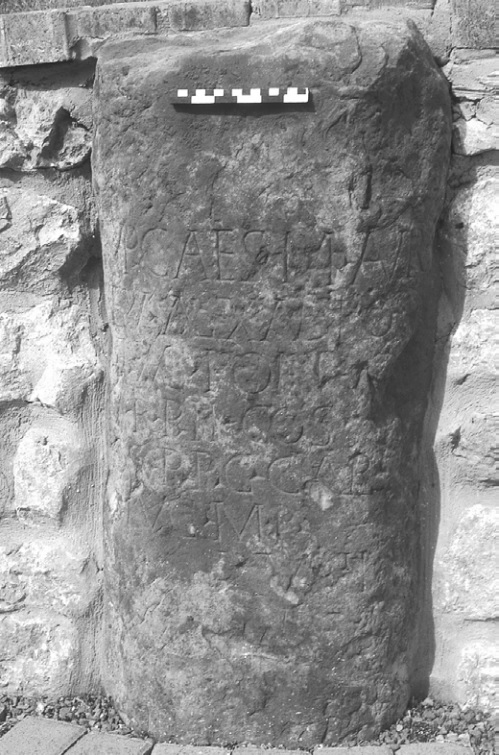 The Langwathby milestone. Scale bar measures centimeters (top) and inches (bottom). From B. J. N. Edwards and D. C. A. Shotter (2005), “Two Roman Milestones from the Penrith Area”. Transactions of the Cumberland & Westmorland Antiquarian & Archaeological Society, volume 5, issue 3 (2005). Page 69.
