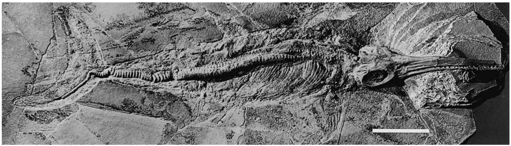Neotype specimen of Aegirosaurus leptospondylus, found within the Solnhofen Formation of Bavaria, Germany. Note that the outline of the body is preserved, including the size and shape of the fins. Scale bar = 20 cm. Image from Bardet, Nathalie; Fernández, Marta S. (2000). “A new ichthyosaur from the Upper Jurassic lithographic limestones of Bavaria”. Journal of Paleontology, volume 74, issue 3. Page 505.