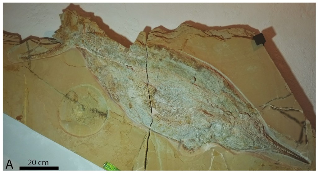 A well-preserved specimen of Aegirosaurus (collection ID code: JME-SOS-08369) from Eichstätt-Blumenberg, Germany showing the rounded outline of the body, in contrast to the somewhat slimmer specimen shown earlier. Scale bar = 20 cm. Image from Delsett, Lene L.; Friis, Henrik; Kölbl-Ebert, Martina; Hurum, Jorn H. (2022). “The soft tissue and skeletal anatomy of two Late Jurassic ichthyosaur specimens from the Solnhofen archipelago”. PeerJ, volume 10: e13173.