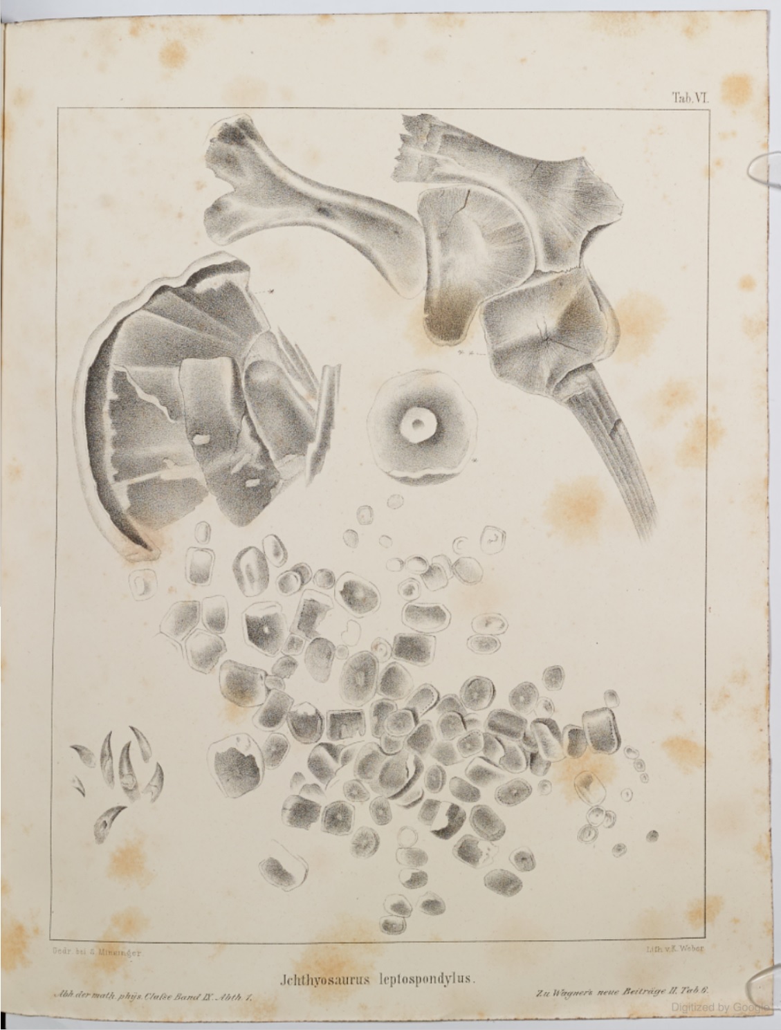 Lithographic print of the original holotype of Ichthyosaurus leptospondylus (later re-named as Aegirosaurus leptospondylus). Image from Wagner, A. (1861). “VIII. Ichthyosaurus leptospondylus”. Neue Beiträge zue Kenntniss der urweltlichen Fauna des lithographischen Schiefers. Table VI.