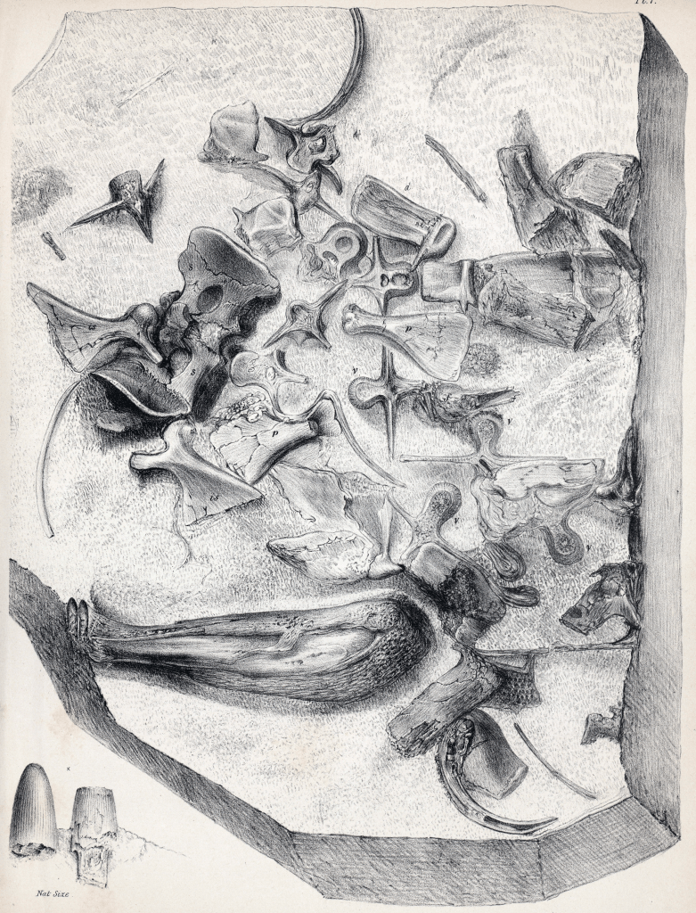 Illustration of the holotype specimen of Goniopholis crassidens. The specimen consists of part of the lower jaw, several teeth, several vertebrae, osteoderms, and parts of the pelvis. (1879). Public domain image, Wikimedia Commons.
