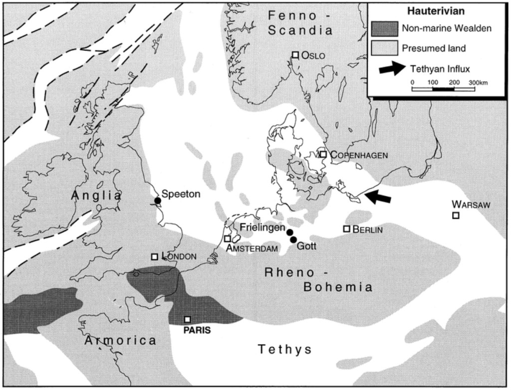 Map of northern Europe, including Britain, northern France, northern Germany, and southern Scandinavia, as it would have appeared during the Hauterivian Stage of the early Cretaceous Period, 131-129 MYA. Image from Mutterlose, Jörg; Ruffell, Alastair (1999). “Milankovitch-scale paleoclimate changes in pale-dark bedding rhythms from the Early Cretaceous (Hauterivian and Barremian) of eastern England and northern Germany”. Palaeogeography, Palaeoclimatology, Palaeoecology, volume 154, issue 3 (November 1999). Page 134.