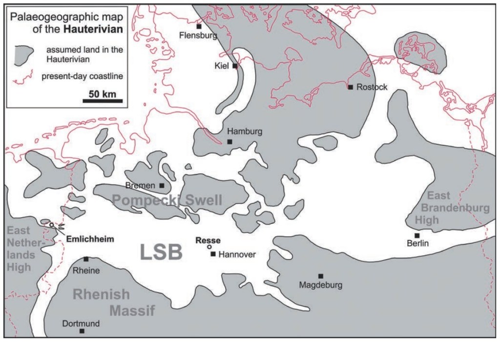 Map of northern Germany during the Hauterivian Stage of the early Cretaceous Period, 131-129 MYA. Image from Möller, Carla; Mutterlose, Jörg (2014). “Middle Hauterivian biostratigraphy and palaeoceanography of the Lower Saxony Basin (Northwest Germany)”. Zeitschrift der Deutschen Gesellschaft für Geowissenschaften, volume 165, issue 4 (December 2014). Page 503.