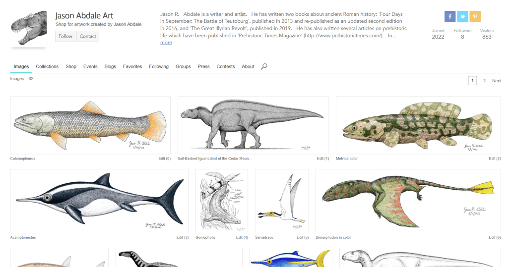 Unfortunately, this venue has not resulted in me establishing myself as a career paleo-artist or researcher as I had hoped it would back when this blog made its debut on the worldwide web. However, my work has definitely been noticed. Once every three or four years, someone will e-mail me and ask if they can use one of my drawings for a museum exhibit. Since I started this blog, my artwork has been on public display for either temporary or permanent museum exhibits in the United States, Canada, and China. Last year, I got my first paid paleo-art commission, followed shortly afterwards by a second. I also set up an account on the art pages Redbubble and Fine Art America. Finally, I have recently discovered that some people online are copying my drawings. I was once told that you know you’re a good artist when other artists are copying your work. Evidently, I’m a good artist.