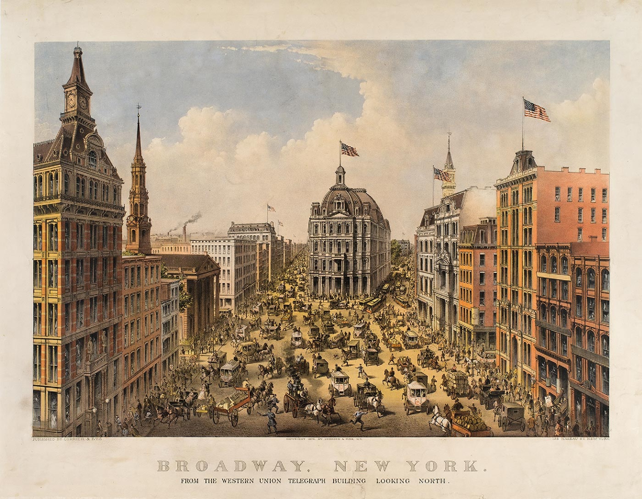 “Broadway, New York. From the Western Union Telegraph Building, looking North”. Hand-colored lithograph, published by Currier & Ives (1875). The New-York Historical Society.