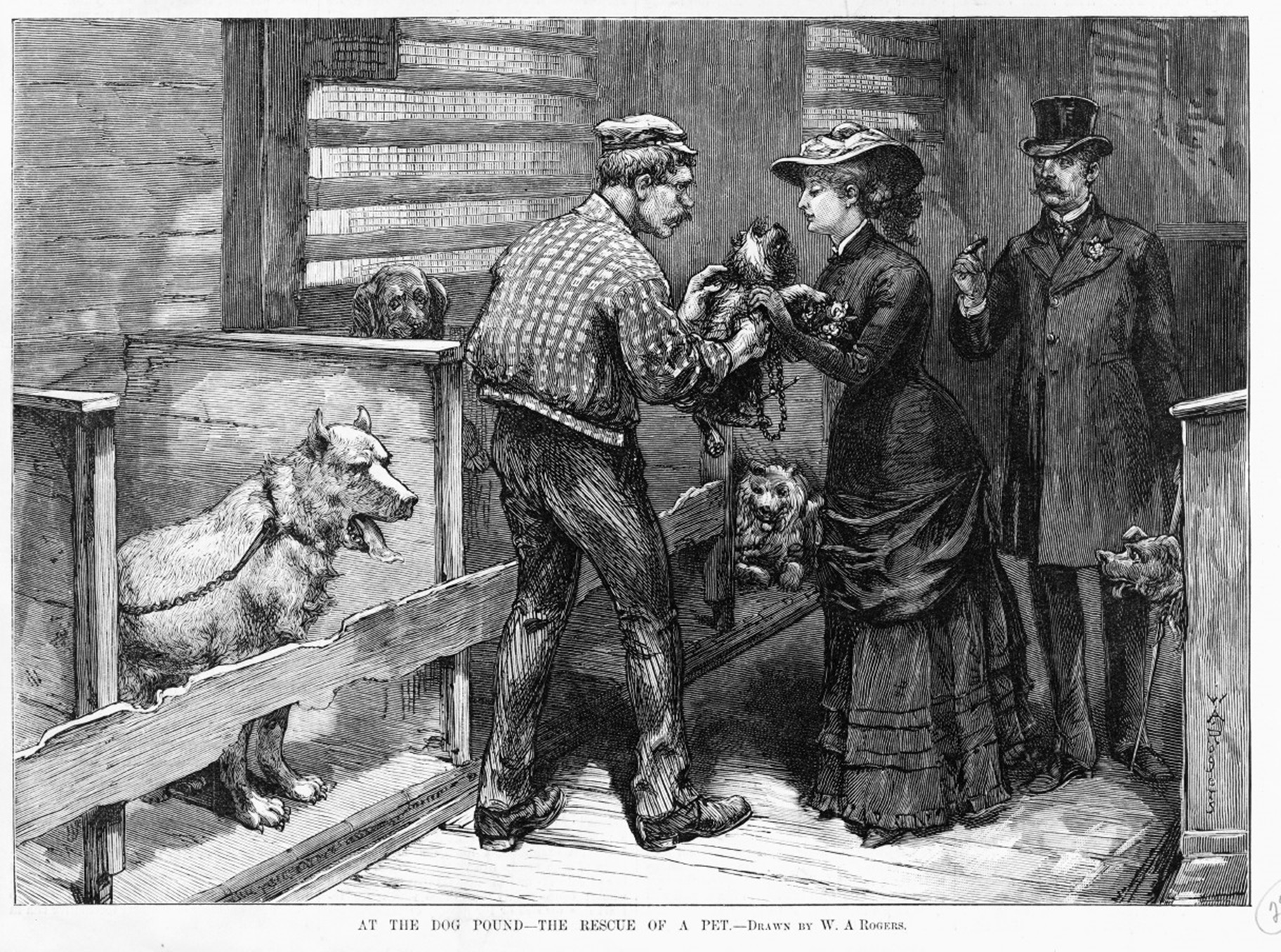 “At the Dog Pound – The Rescue of a Pet”, illustrated by W. A. Rogers for Harper’s Weekly (June 16, 1883).