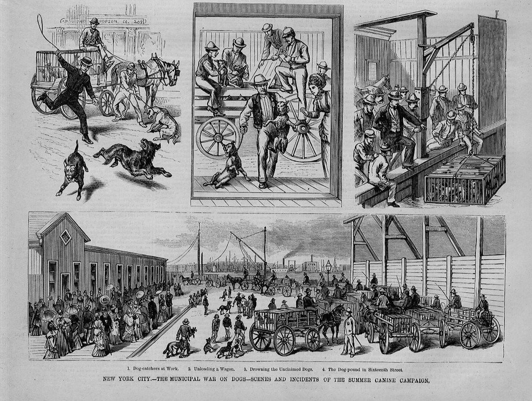 “New York City – The Municipal War on Dogs – Scenes and Incidents of the Summer Canine Campaign”. Frank Leslie’s Illustrated Newspaper (July 1877).