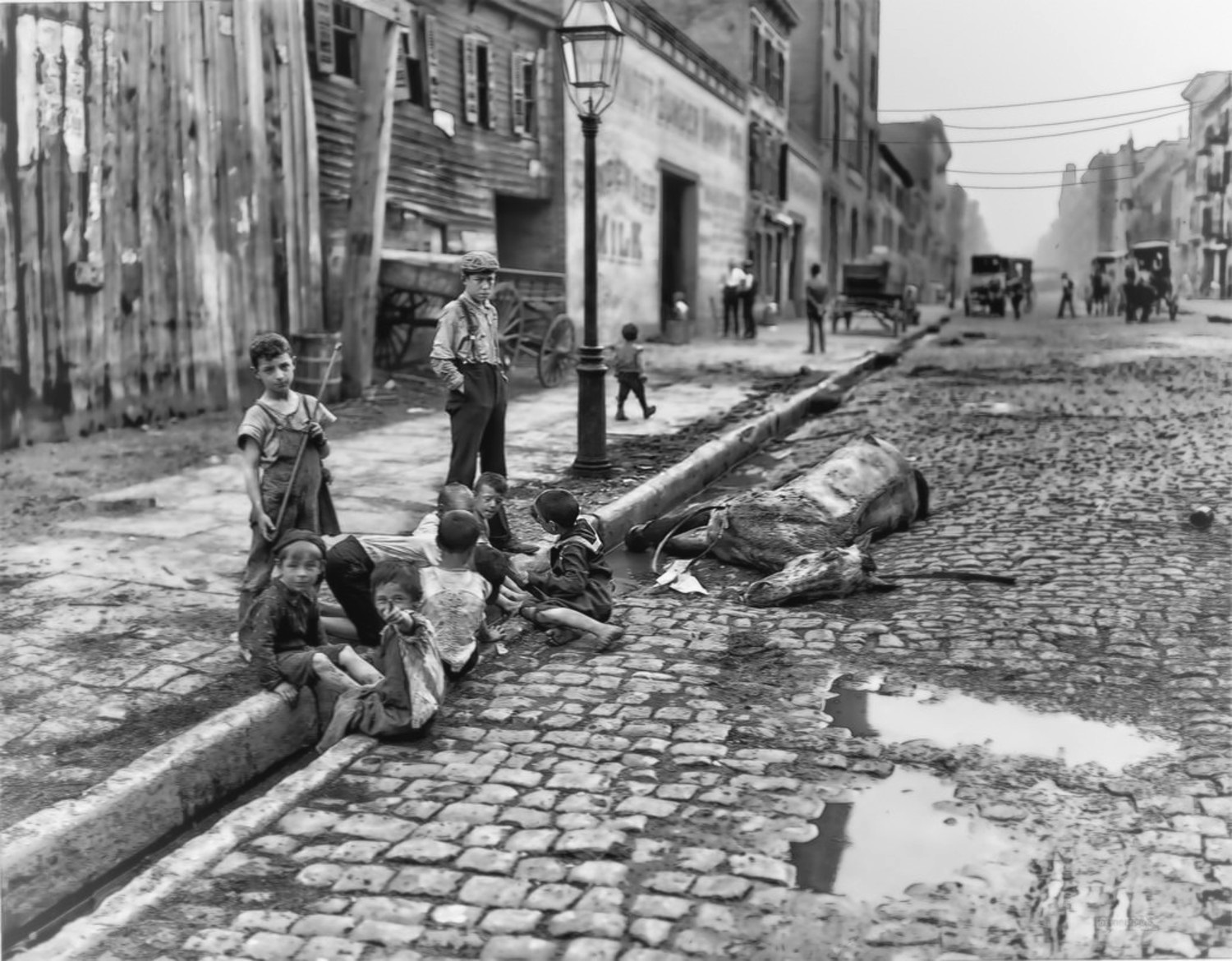 A group of children play in a gutter near a dead horse on West 125th Street, 1903. It was not uncommon for dead animals to be left to rot along the curb for days or weeks. Photograph by Joseph Byron. Library of Congress. https://www.loc.gov/item/2016794664/.