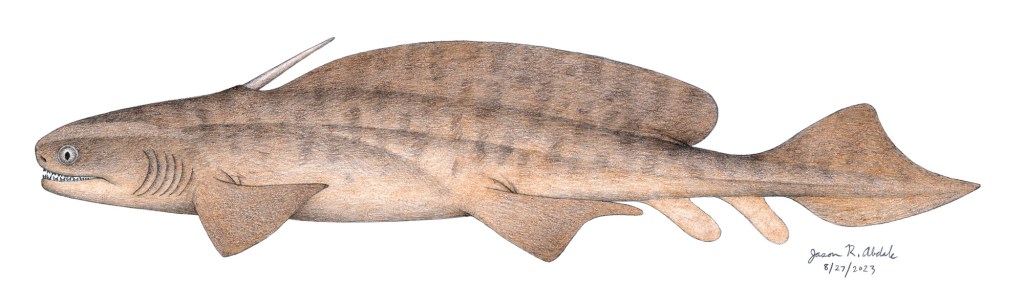 I love prehistoric shark relatives, especially when it means discovering a new one (for me)! The colors are lovely and very plausible for a bayou environment. I love to see the layering of color with colored pencils. It provides a lot of depth and subtlety to the pattern that I’m sure looks even better in person. 🙂