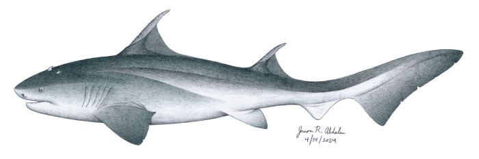 The genus Strophodus is divided into fourteen species, most of which are found in middle Jurassic deposits in Europe, along with a few others from India. Because very few body fossils of this animal have been found, the differentiation of species is largely based upon subtle differences in the shape of the teeth. As with most prehistoric sharks, the best evidence that we have of this animal are fossilized teeth. Like many members of the hybodont family Acrodontidae, Strophodus had rows of thick rounded teeth designed for cracking open hard shells. There were five to six rows of thick rounded teeth on each side of the front of its upper jaw, and another series of five to six rows in the middle of the front of its lower jaw – the lower jaw neatly slotted into the upper jaw like a nutcracker. Strophodus likely had very large jaw muscles to crunch through the hard shells of ammonites or possibly even sea turtles, giving it a very beefy muscular profile. Due to the abundance of ammonites and other shellfish, taking advantage of such an abundant food resource would be very advantageous. Evidently Strophodus was very good at it, reaching sizes comparable to a modern-day Bull Shark. Furthermore, just like a Bull Shark, there’s evidence from isotopic analysis of its teeth that Strophodus was able to survive in brackish water, and might have even been able to dwell in freshwater for limited periods of time (Leuzinger et al 2015; Stumpf et al 2023). Fossil remains of Strophodus‘ close relative Acrodus are also frequently found in freshwater deposits, which means that all members of the family Acrodontidae were likely capable of living in both saltwater and freshwater (Cuny et al 2014).