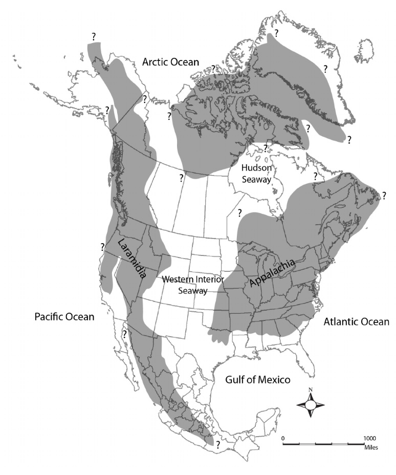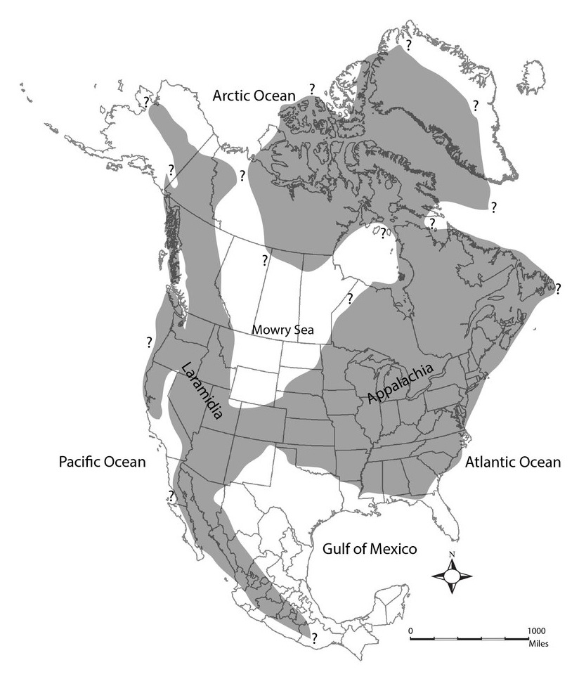 The humidity was compounded even further by eastern Utah’s close proximity to the shoreline of the Mowry Sea. This was a body of Arctic saltwater which had penetrated into North America from the Mackenzie River Basin in northern Canada, and had been steadily encroaching further and further southwards and expanding wider and wider across the center of North America with every passing year (Jeletzky 1971, pages v., 42-49). Geological evidence suggests that the Mowry Sea was murky and muddy, and had poor oxygen levels; modern-day analogies to such an environment would be the Mississippi Delta, the waters of New York Harbor, and the western half of the Long Island Sound (Jeletzky 1971, page v.; Bergendahl et al 1960, pages 647-651; Stewart and Hakel 2006, page 161; Sprinkel et al 2012, Page 12). At the same time that the Mowry Sea was expanding, the Gulf of Mexico was also increasing in size due to tectonic shift and rising sea levels, moving further and further northwards. Only a narrow land bridge spanning what’s now southern Colorado and northern New Mexico known as the Transcontinental Arch separated these two water bodies from each other and connected the western and eastern halves of the continent. Sometime during the late Cenomanian and early Turonian Stages, both the Mowry Sea and the Gulf of Mexico dramatically grew in size in an event known as the Greenhorn Transgression. The Mowry Sea would merge with the Gulf of Mexico, creating the Western Interior Seaway, and split North America completely in half (Slattery et al 2013, pages 28, 36, 38-39; Elderbak et al 2014, page 29). The exact date when the joining of the northern and southern seas occurred has been subject to a lot of discussion over the decades, with different articles giving different dates as to when it happened. Robinson-Roberts and Kirschbaum (1995) states that the creation of the Western Interior Seaway occurred during the Neogastroplites cornutus biostratigraphic zone at the beginning of the Cenomanian Stage (Robinson-Roberts and Kirschbaum 1995, pages 5, 15). Slattery et al (2013) states that the Mowry Sea and the Gulf of Mexico joined during the Neogastroplites maclearni biostratigraphic horizon (Slattery et al 2013, page 39), and elsewhere in the article during the Neocardioceras juddii biostratigraphic horizon (Slattery et al 2013, page 40). Neogastroplites maclearni was a species of ammonite whose fossil shells are found within the uppermost layer of the Mowry Shale (Reeside Jr. and Cobban 1960, page 27). The ammonite Neocardioceras juddii lived during the late Cenomanian around 93 MYA (“Neocardioceras juddii”). Most recently in 2023, it was stated that the Greenhorn Transgression took place during the late Cenomanian Stage between 94.6-94.0 MYA based upon the dating of zircons found within volcanic sediments (Renaut et al 2023).