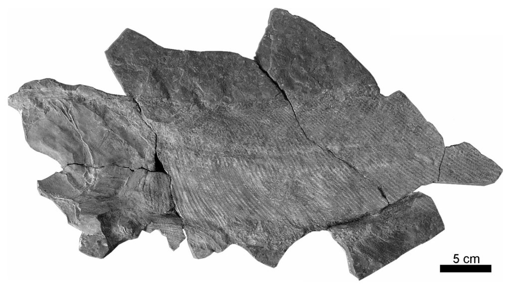 Holotype specimen of Challaia elongata (collection ID code: MLP 44-VII-16-3) from the Los Rastros Formation within the Bermejo Basin near Agua de La Peña Creek, San Juan Province, Argentina. Scale bar = 5 cm. López-Arbarello, Adriana; Rogers, Raymond R.; Puerta, Pablo (2006). “Freshwater actinopterygians of the Los Rastros Formation (Triassic), Bermejo Basin, Argentina”. Fossil Record, volume 9, issue 2 (August 2006). Page 251.