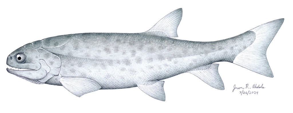 One of the most obvious features of Challaia is its large eyes. The holotype of Challaia elongata had been found within dark grey siltstone, suggesting that it lived in still or slow-moving murky muddy water (López-Arbarello et al 2006, page 241). Having unusually large eyes would be a definite advantage in such a poor-visibility environment. The eyes are also positioned very forwards on the head, and it’s possible that Challaia possessed heightened binocular vision. The numerous longitudinal ridges on its scales would help to reduce the sheen of sunlight bouncing off of the scales’ surface, very similar to how buttons on many military uniforms have a roughened bumpy texture to prevent them from having a shiny appearance and thus giving your position away to the enemy. Challaia’s teeth were also very large in proportion to its jaws, giving Challaia a formidable profile. Other fish were found within the same rocks as Challaia, such as Rastrolepis and Gualolepis, but they were only half the size of their fang-toothed neighbor, and they likely would have made a tasty snack. To protect themselves from attack, Rastrolepis was covered in rows of thick enameled scales like medieval chain-mail armor. Gualolepis had smaller thinner scales, but each one was reinforced with a thick central rib to provide increased durability. Challaia’s unusually large conical teeth might have been specially-designed to punch through the tough armored covering of these smaller fish species. All told, Challaia must have been a very impressive hunter.