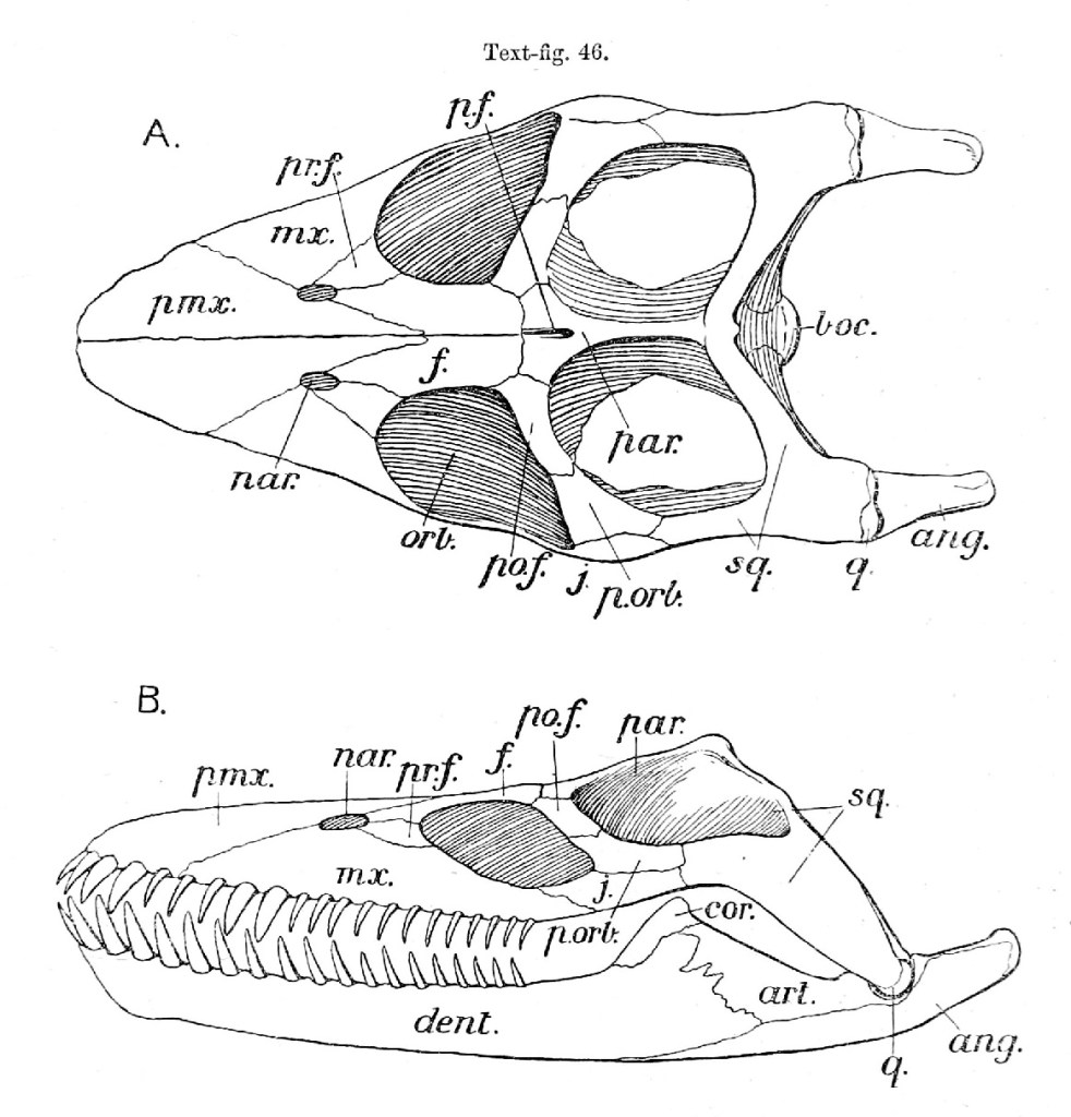 Skull of Muraenosaurus leedsi. Illustration from Andrews (1910), page 85.