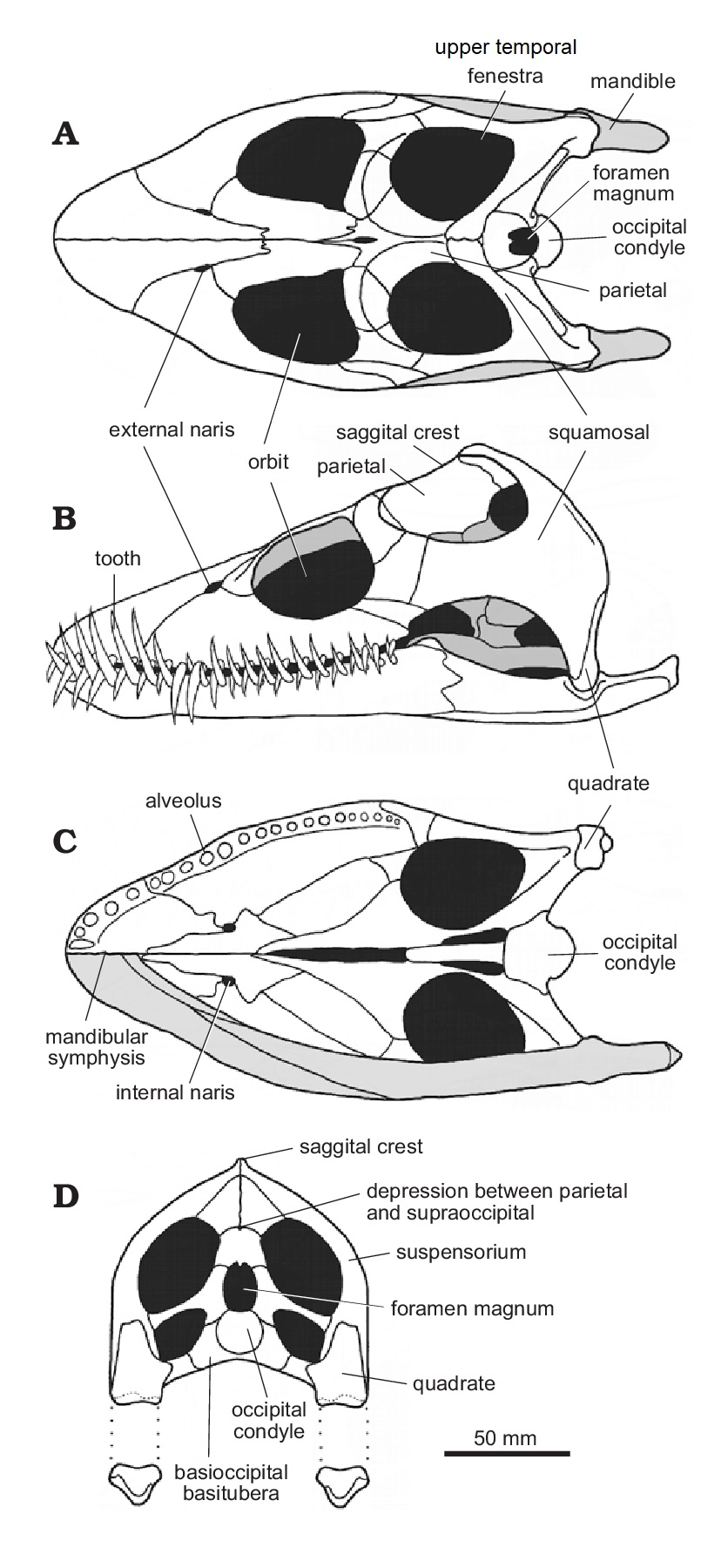 Skull of Muraenosaurus leedsi, based upon the specimens LEICT G18.1996 and BMNH R.2861. Scale bar = 100 mm. Illustration from Evans (1999), page 195.