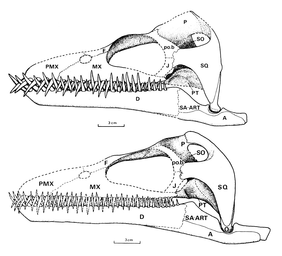 In-scale comparison of the skulls of Cryptoclidus eurymerus (top) and Kimmerosaurus langhami (bottom). Illustrations from Brown (1981), pages 259 and 304.