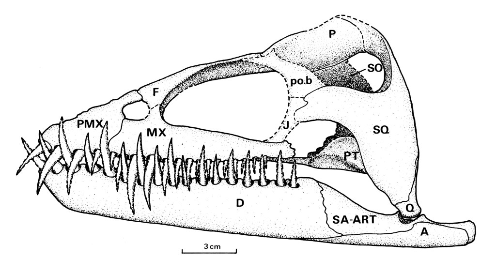 A third fragmentary specimen consisting of pieces of the lower jaw along with fragments of the squamosals, quadrates, jugals, and post orbitals (collection ID code: BMNH R.1798) which had been sitting in the museum’s collections since 1890. The specimen had been discovered by one Robert Damon (1813-1889), and in 1890, it was gifted to the British Museum of Natural History. When this specimen was re-examined, it was discerned that this, too, belonged to Kimmerosaurus. This specimen had been found near Weymouth and also came from the Kimmeridge Clay Formation (Brown et al. 1986, pages 225-226, 228-229; Steward 1989, page 80; Taylor 1989, page 56).