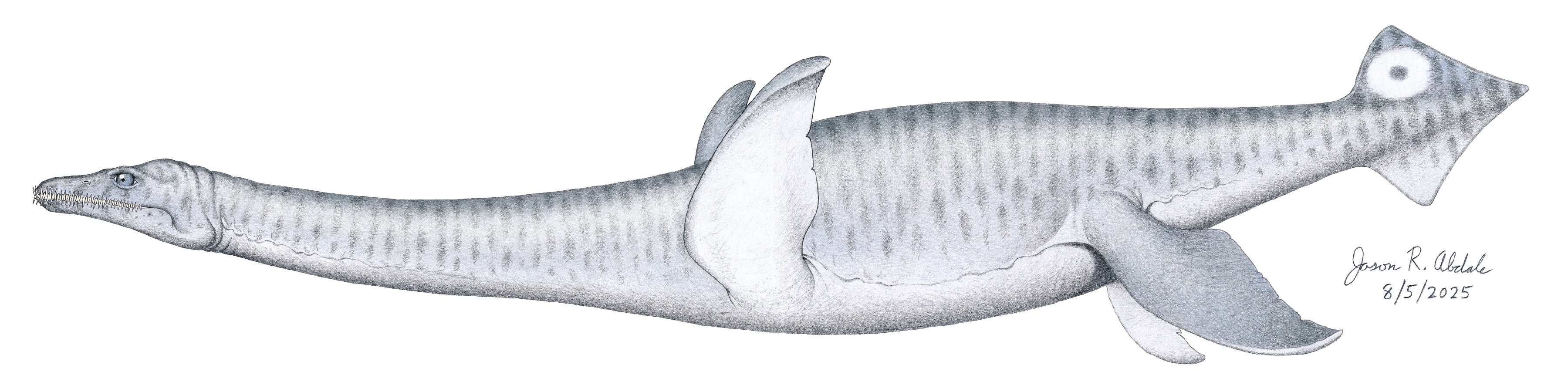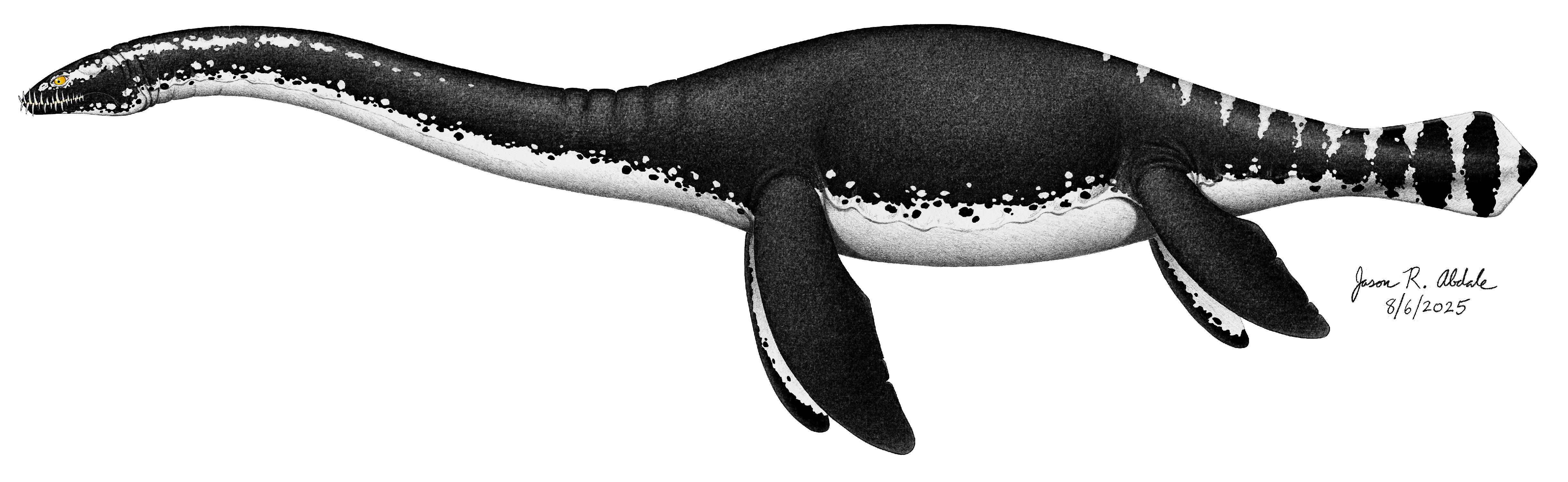 Hypothetical reconstruction of the 20 foot long plesiosaur Colymbosaurus megadeirus, dated from the upper Kimmeridgian to upper Tithonian Stages of the late Jurassic Period 152-145 MYA. The image is based upon the skeletal reconstruction of Muraenosaurus leedsi by Andrews (1910), the skull reconstruction of Muraenosaurus leedsi by Noè et al. (2017), and the skull reconstruction of Tricleidus seeleyi by Brown (1981). Image © Jason R. Abdale (August 6, 2025).