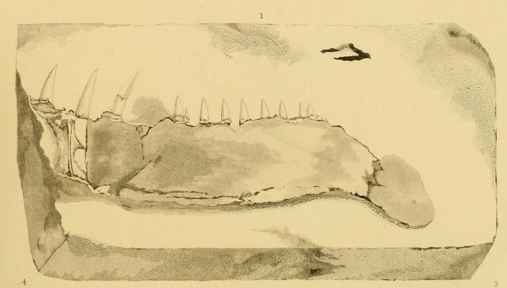 During the early 1820s, another partial specimen was uncovered within southern England in a region called the South Downs, which is a vast area of countryside within the English counties of Hampshire and Sussex extending for 260 square miles in area. This region is renowned for its astounding ancient Roman archaeological sites, such as the spectacular Roman villas located at Bignor and Fishbourne. However, it is also a rich site for marine fossils dating to the Cretaceous Period. In 1822, Dr. Gideon Mantell, a medical doctor and avid rockhound (who would later earn scientific immortality as the man who named Iguanodon) wrote a book entitled The Fossils of the South Downs. In its pages is an illustration of a fish’s lower jaw measuring 5 and a half inches long featuring some truly vicious-looking teeth which was found in the Lower Chalk near the Sussex town of Lewes (Mantell 1822, page 241). Of this find, Dr. Mantell says the following: