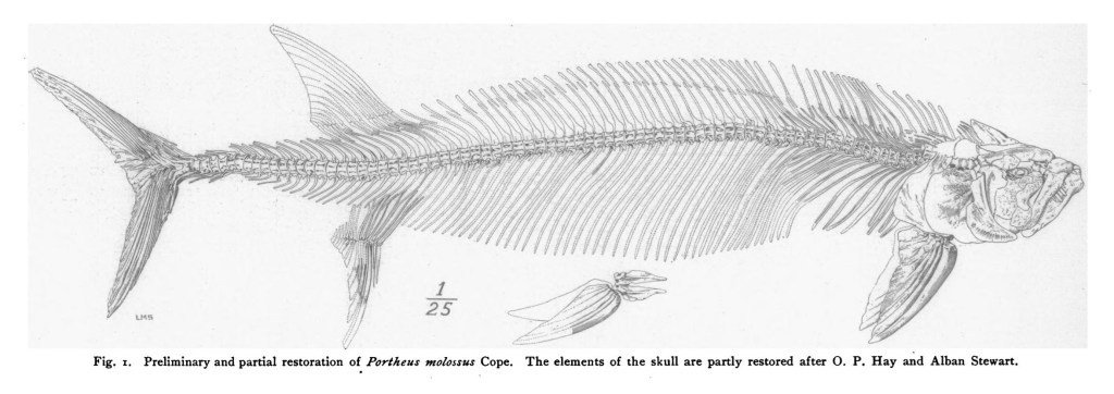 Osborn, Henry Fairfield (1904). “The Great Cretaceous Fish Portheus molossus Cope”. Bulletin of the American Museum of Natural History, volume 20 (1904). Pages 377-381.