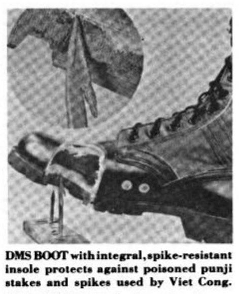 During the Korean War and the Vietnam War, landmines resulted in a large number of foot and leg amputations. This led to Natick Laboratories researching how to make combat boots more blast resistant. The solution was to incorporate an investment-cast stainless steel wedge filled with an aluminum honeycomb into the new model for the jungle boot. (Reed 1966, pages 43-44; “Natick Pamphlet Details Vietnam Support”, page 26). A less obvious addition was adding a thin steel plate inside the sole of the boot to guard against punji sticks. Earlier, a separate steel plate could be slipped into the shoe, but the 3rd Pattern DMS jungle boot had a steel plate incorporated directly into the boot’s sole (“Natick Pamphlet Details Vietnam Support”, page 26).