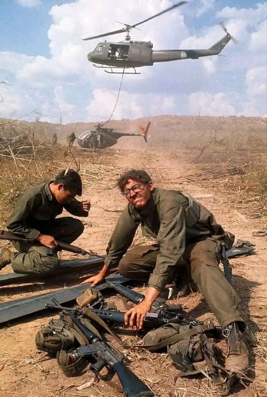 In 1971, a UH-1 Huey is ready to lift a downed OH-6 Cayuse helicopter. The man in front is wearing 5th Pattern DMS jungle boots, which had a zipper instead of laces. Notice that he has rigged a grenade ring onto the zipper to make it easier to grab onto. Image from Daugherty, Leo J.; Mattson, Gregory Louis. Nam: A Photographic History. New York: Barnes & Noble Books, 2001. Page 477.