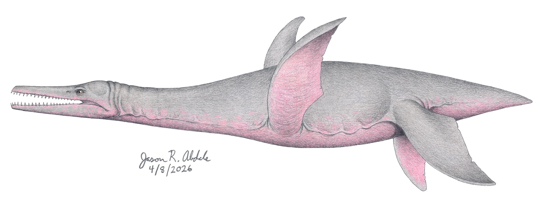 Below is my reconstruction of Sulcusuchus, based upon its fragmentary fossils as well as the related polycotylid Dolichorhynchops. The grayish-pink coloration was inspired by modern-day river dolphins.